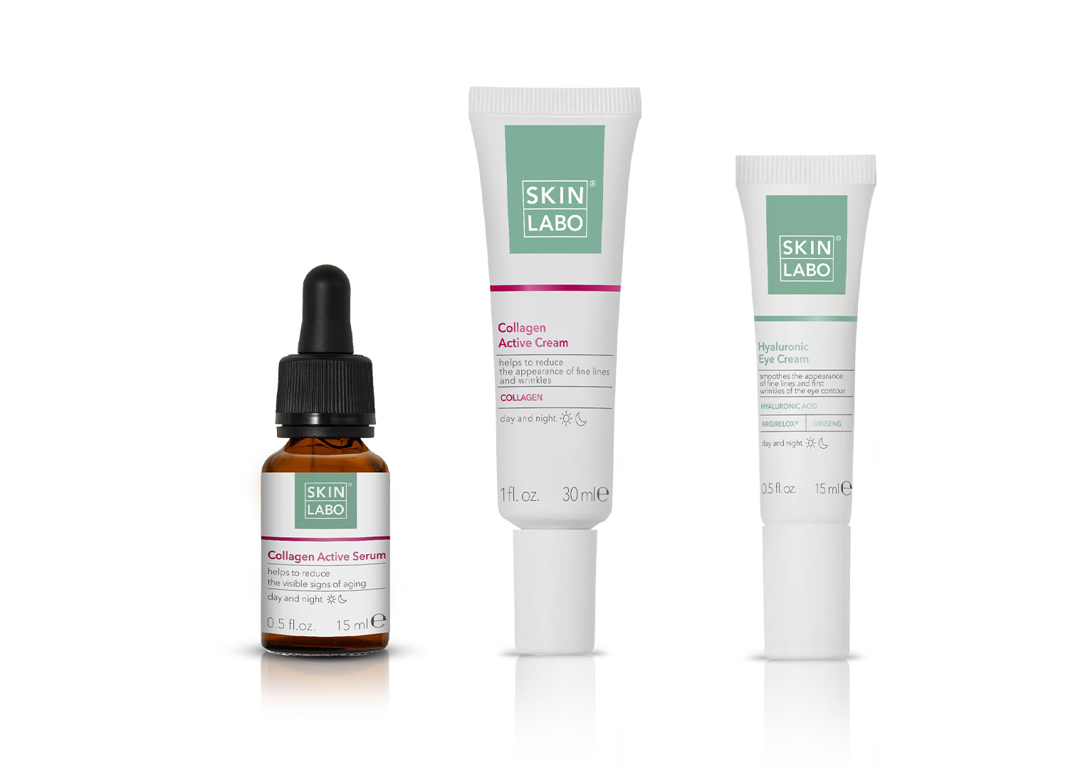 Aplicați Crema activă cu colagen (2) prin masarea pe față până când este complet absorbită, apoi completați tratamentul cu Crema pentru conturul ochilor cu acid hialuronic (3) prin tapotare și masaj ușor dinspre interiorul spre exteriorul conturului ochilor.